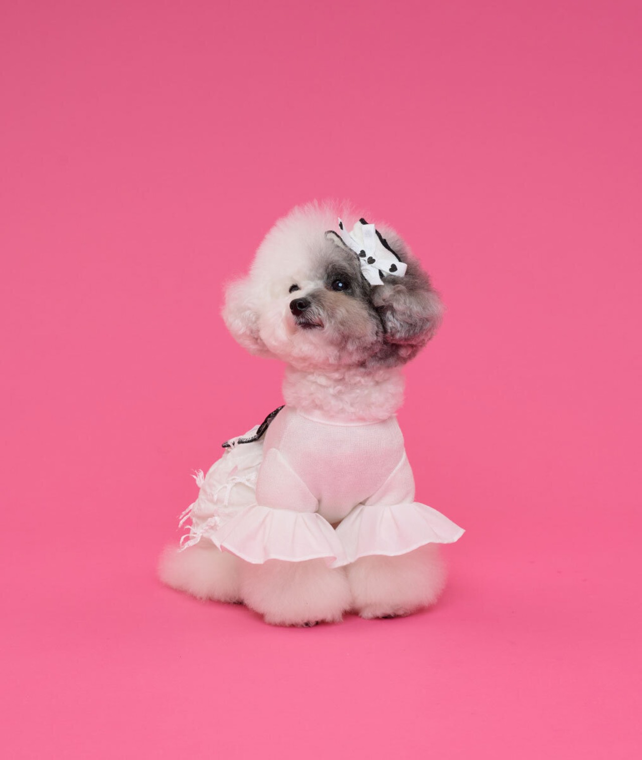 ふわふわしたラッフル袖とテクスチャー感のあるスカートとボリューム感を表現したクラシックなデザイン。