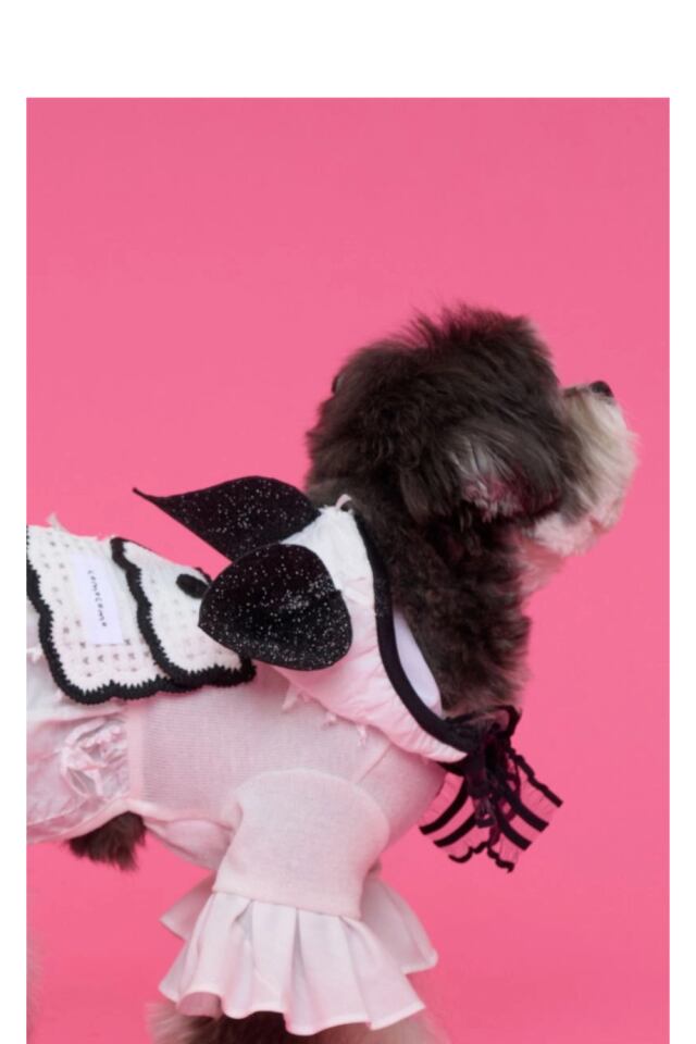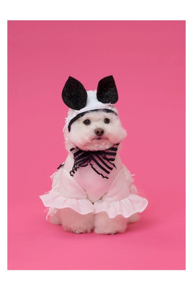 ボンネットは白い生地でできていて、上部には大きな黒いキラキラした耳のような飾りがついています。 まるでウサギの耳のようでもあり、子犬の無愛想な顔にとてもよく合っていて、可愛らしさを演出してくれます。