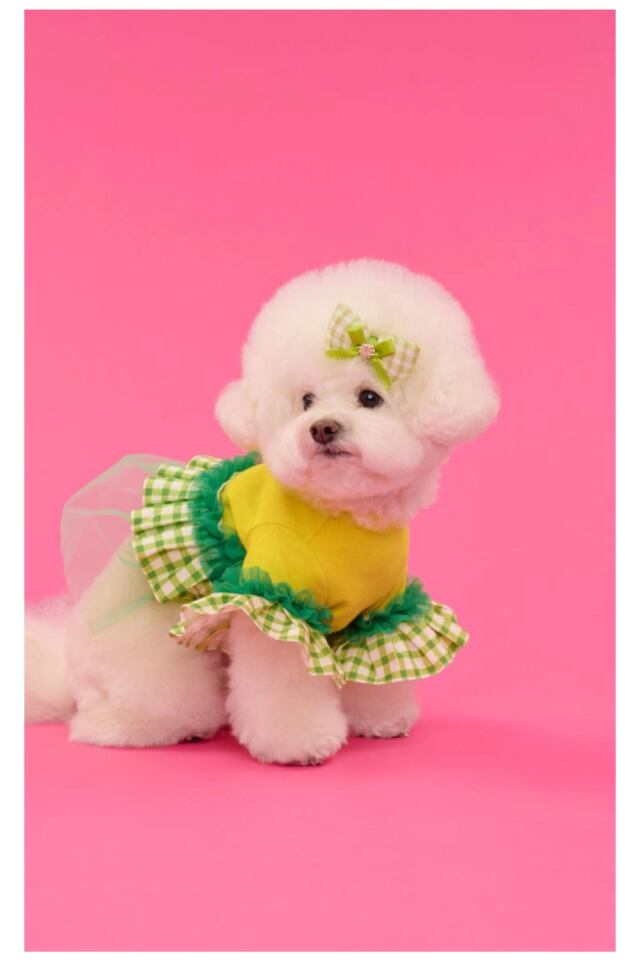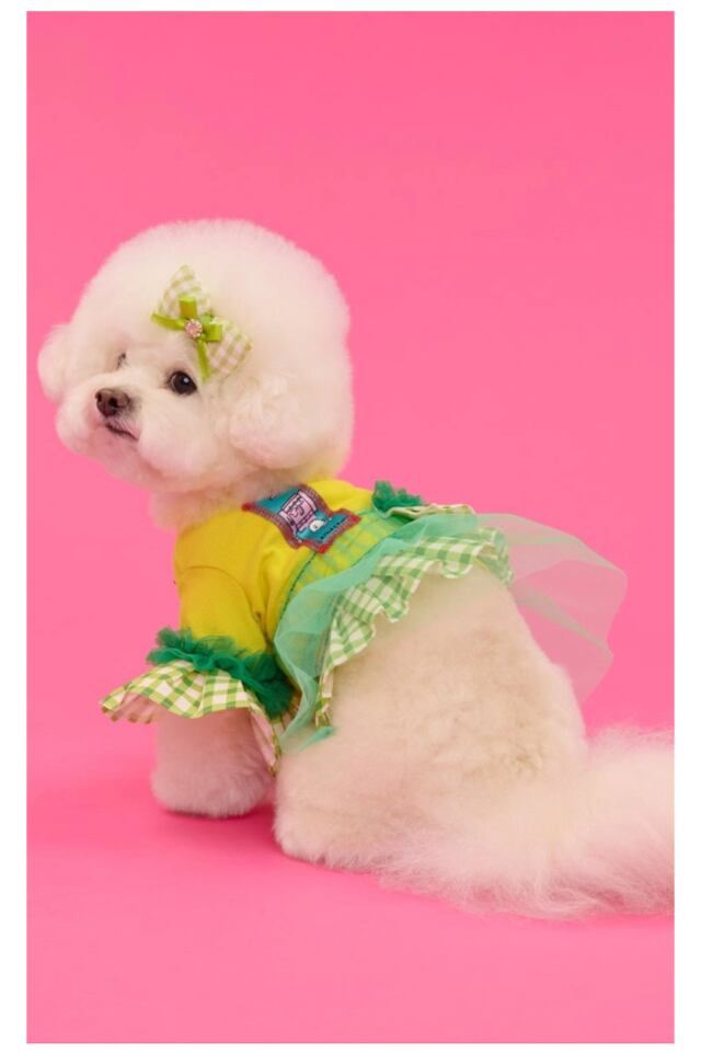 ポップなカラー感で仕上げたさわやかなサマールック さわやかなグリーンチェックの生地にリボンでキュートでサプライズを表現したアクセサリーで