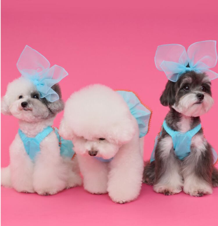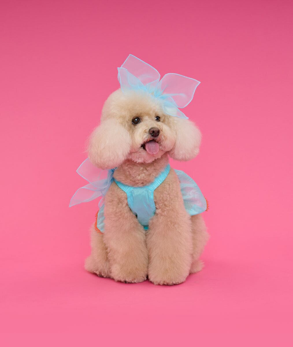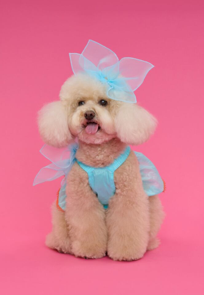 おとぎ話の中の妖精のように愛らしくロマンチックなムードシフォン生地で作られ、まるで雲のように柔らかく空気のように軽い雰囲気を演出します。頭上のオーガンザリボンはエレガントながらもおとぎ話の印象を与え、パーティルックや撮影に最適な仕上がりです。