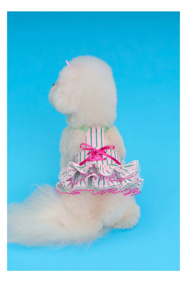 後ろまで可愛く!豊かなフリルとリボンディテールがポイントであるこのワンピースは歩くたびにサランサラン広がるスカートラインでペットの魅力をさらに引き立ててくれます。