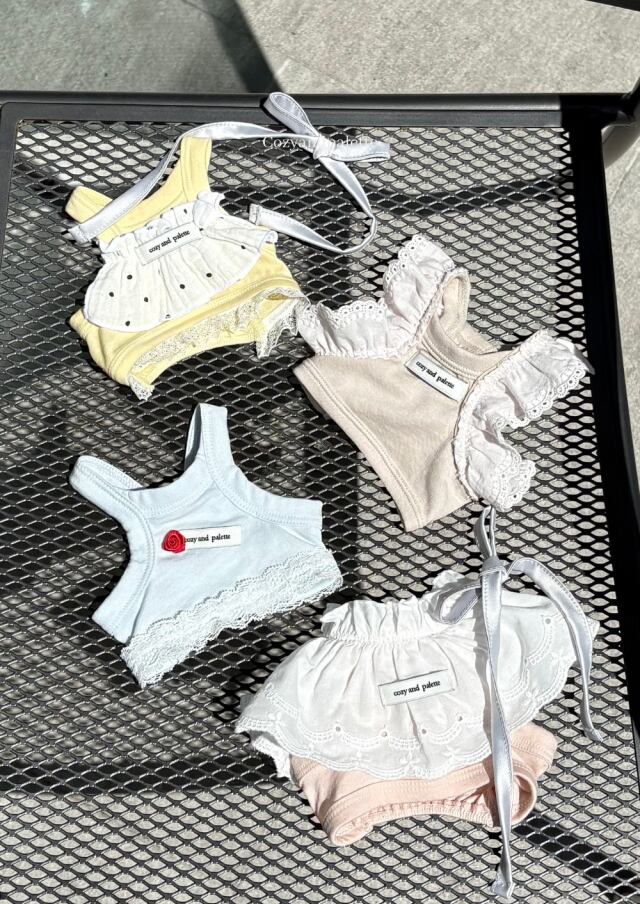 – バストラインまたは背中のラインに可愛いレースフリル、ミニバラ、ドットリボンなどそれぞれ違うディテールポイント