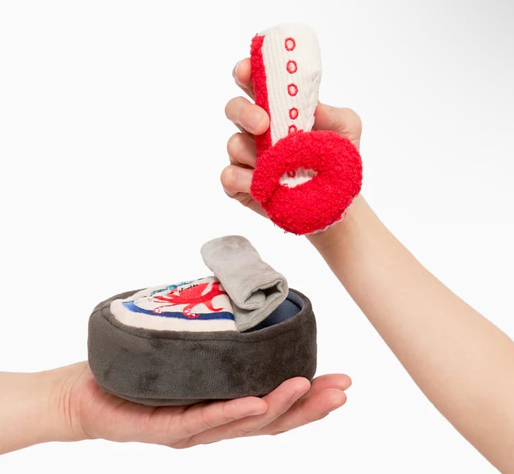 クリンクルペーパー、スクイーカー、ロープ遊びの要素が一体となった「2 in 1」の仕掛けで、飽きずに楽しめます。