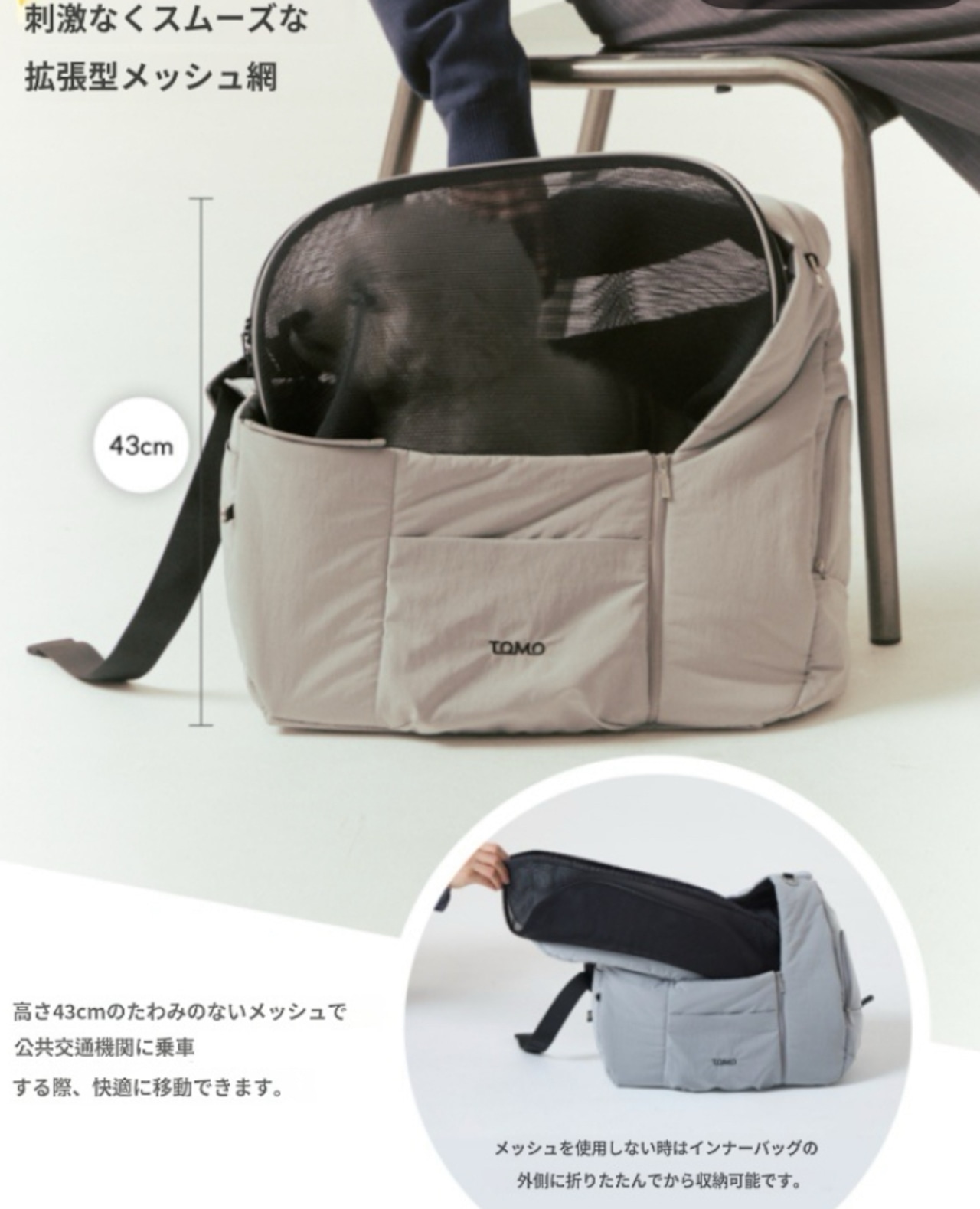 43cm高さのメッシュで、公共交通機関の利用時も快適に移動可能。