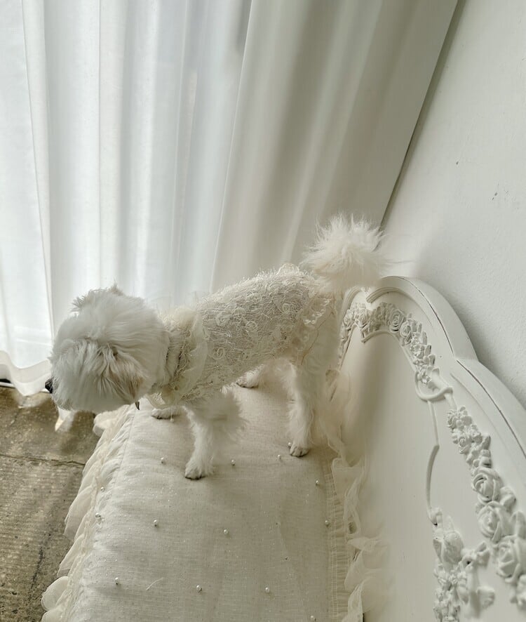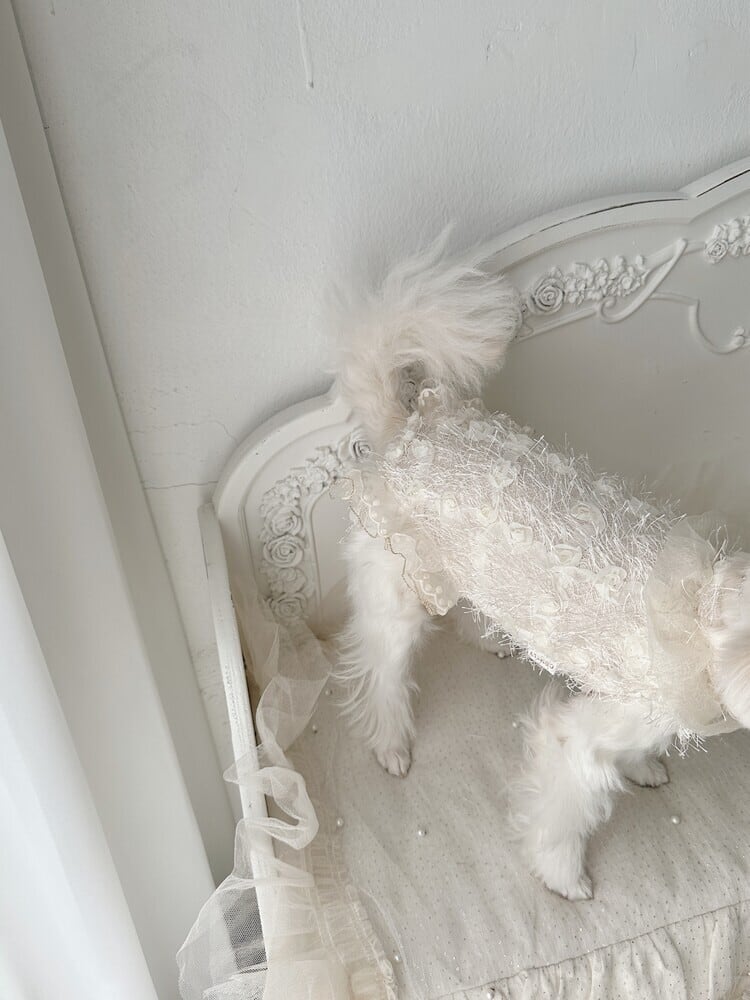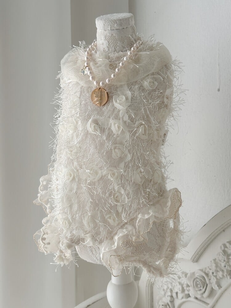 ローズパターンの生地にやわらかなフェザーディテールを重ね、優雅でプリンセスのような雰囲気を纏った特別なアイテムです。