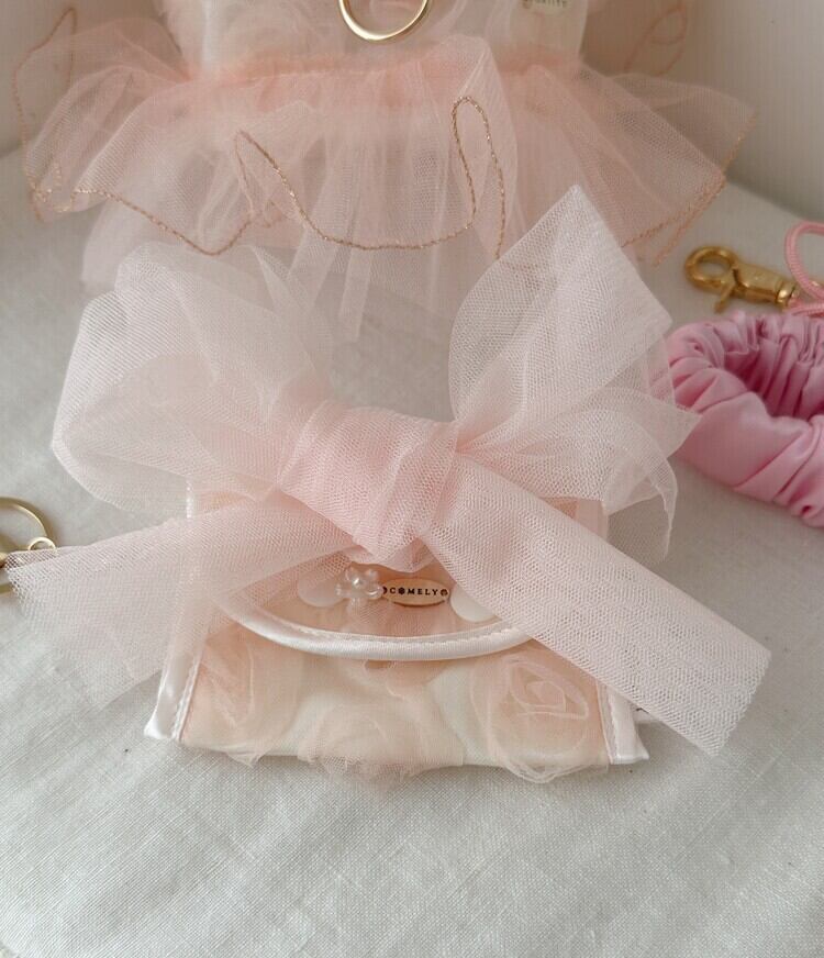ほのかなピンクのチュールの上に重ねられたフリルと ハンドメイドのローズのディテールが組み合わされたデザインで、 高級感の中にも柔らかく愛らしい雰囲気を表現しています。