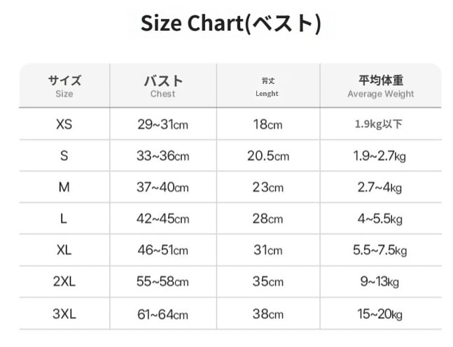 ✓ 被毛の量や体型によって、平均体重は異なる場合があります。