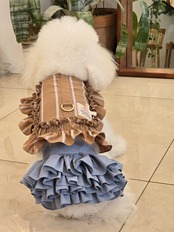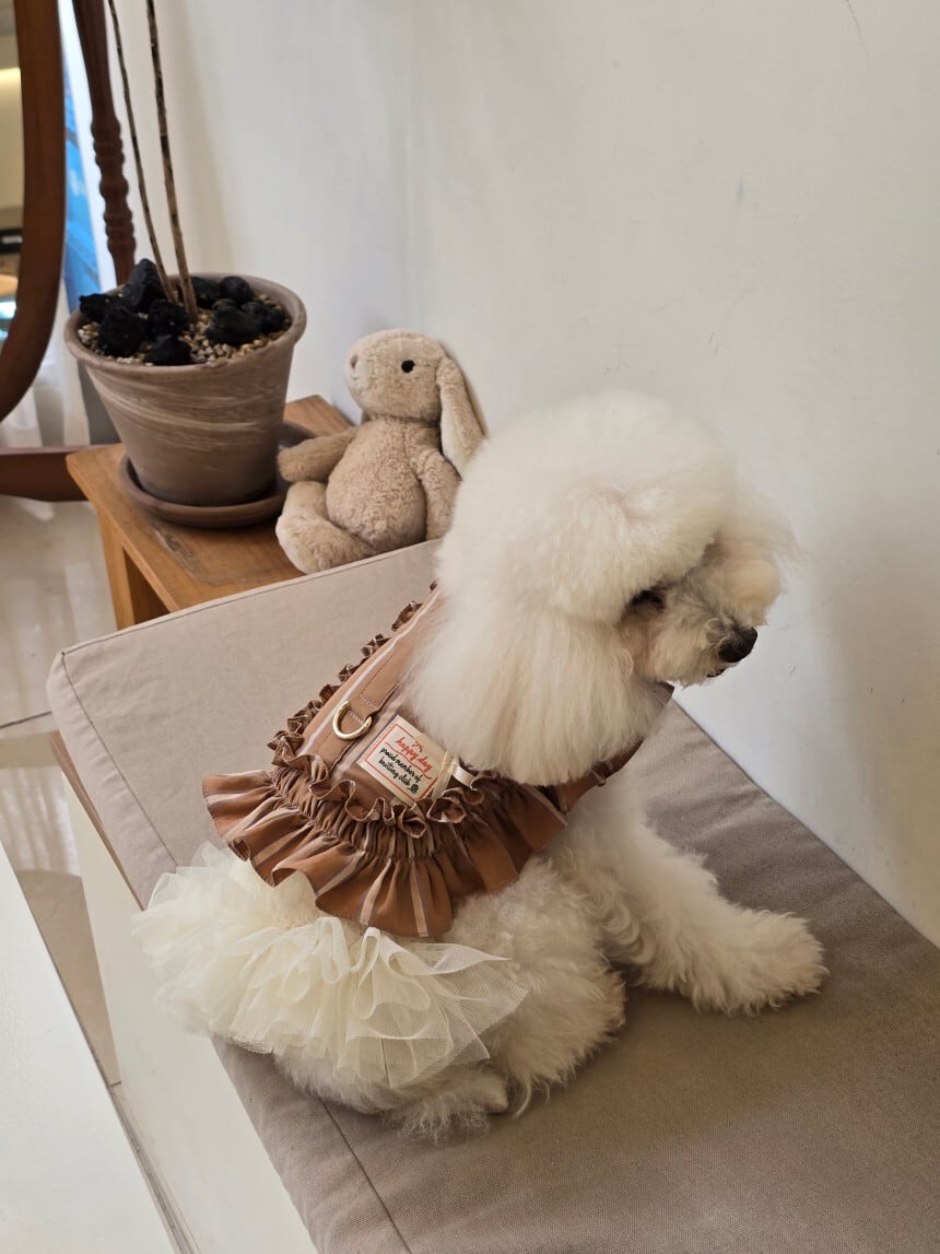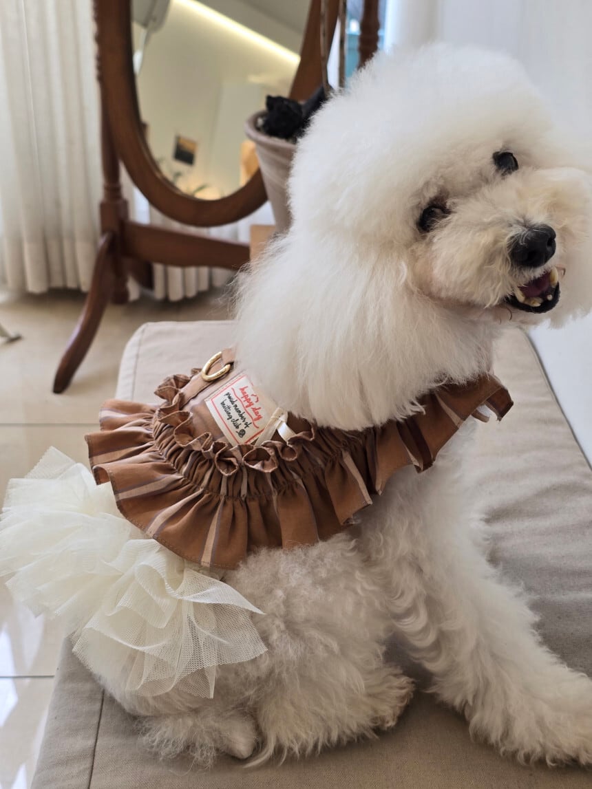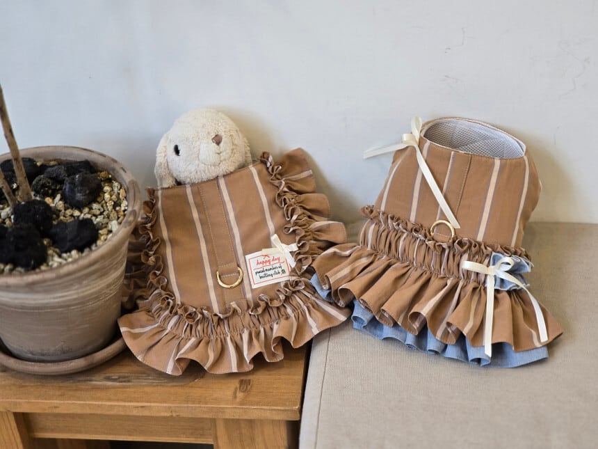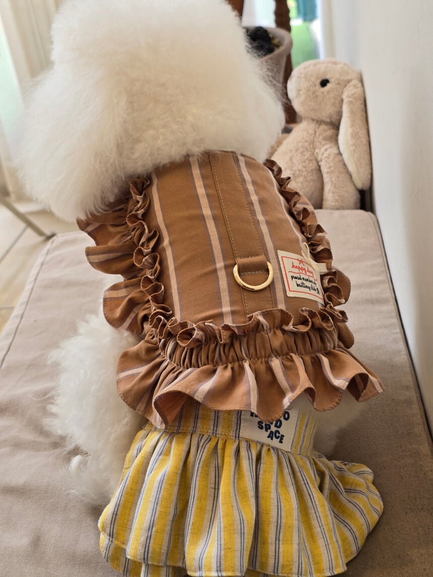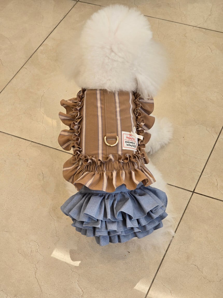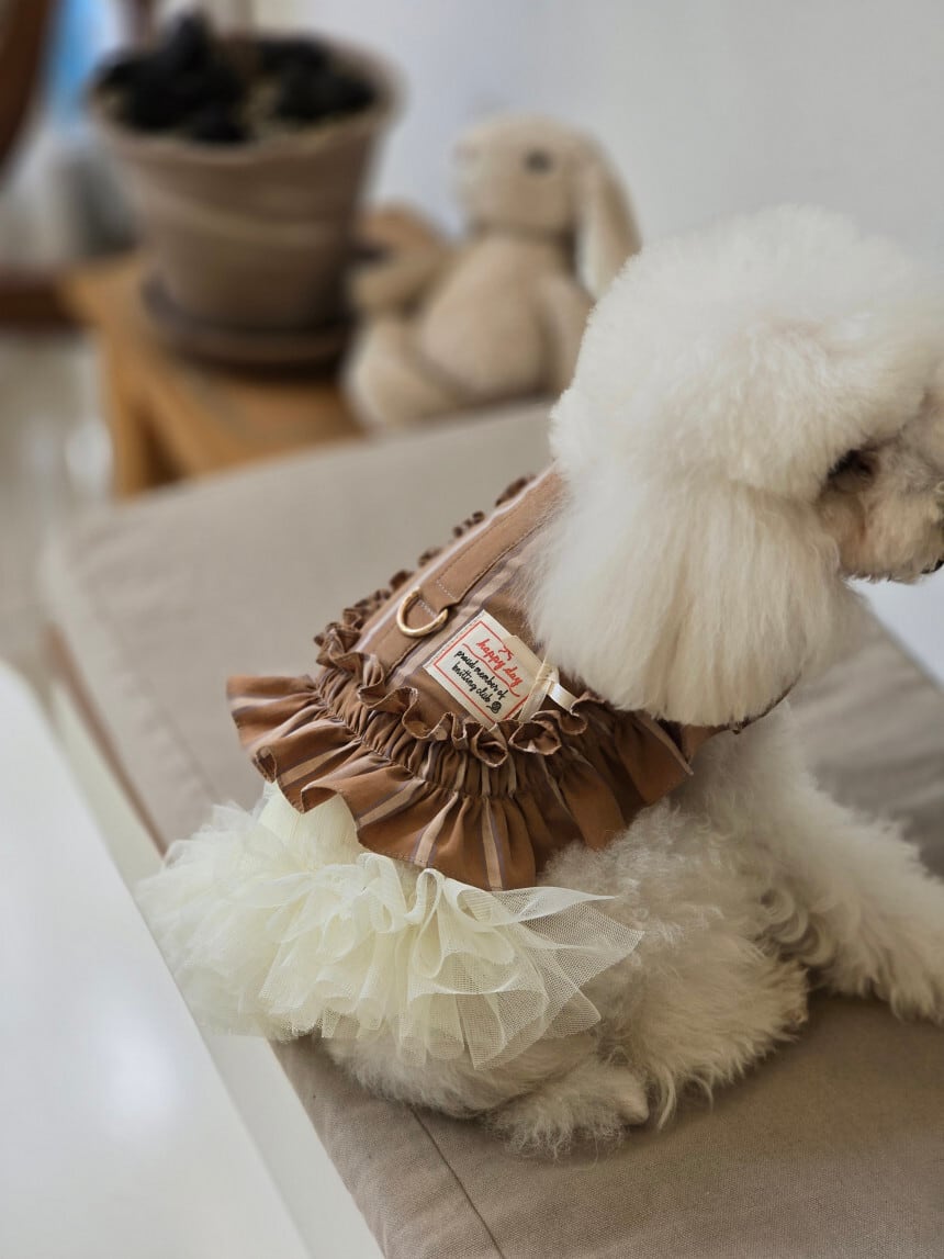 上品なストライプに、ふんわりと立体感のあるフリルを贅沢にあしらったクラシカルハーネス。