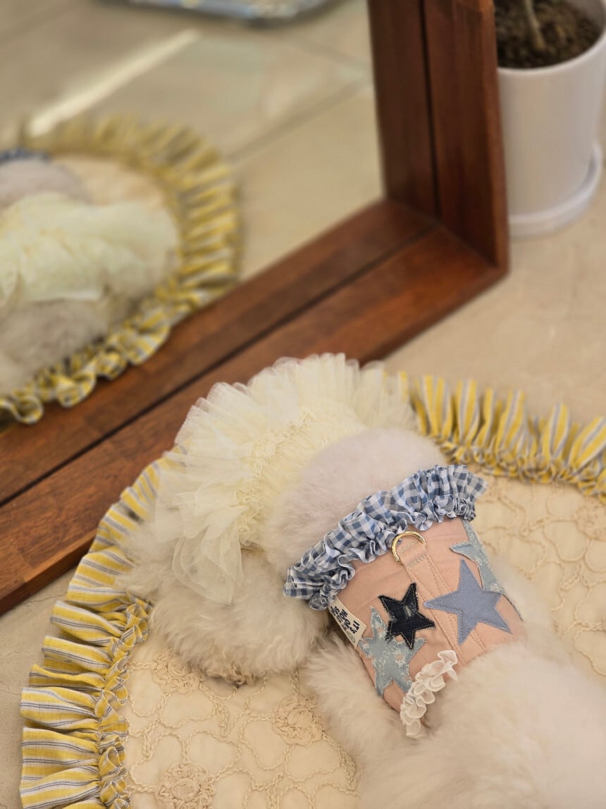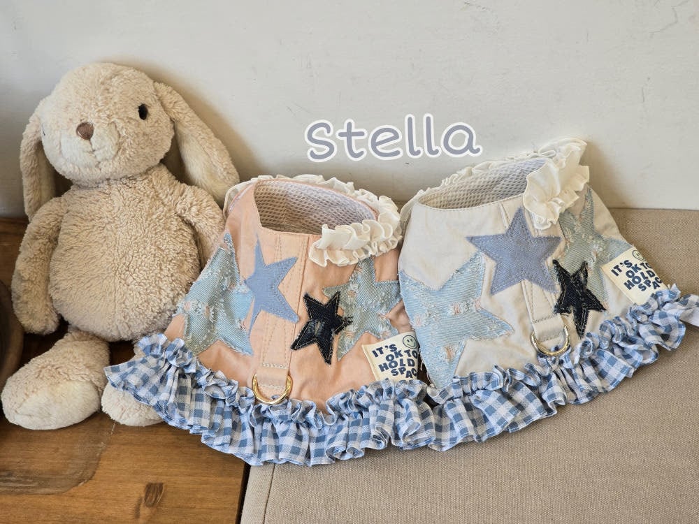 やわらかなピーチベージュにブルーデニムのスター刺繍を重ねた、