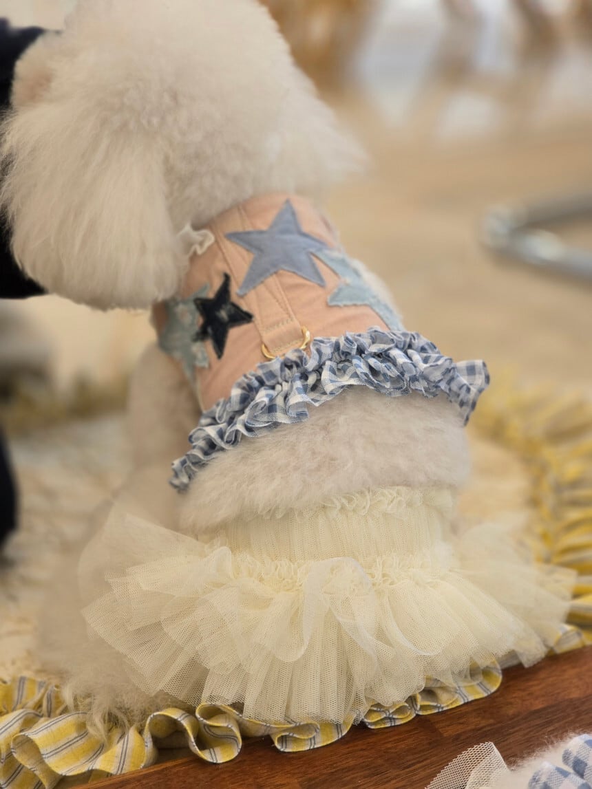 異素材を組み合わせた立体的なスターとギンガムチェックのフリルが、