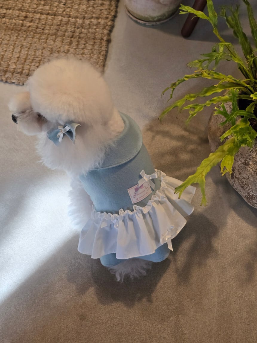 襟元の丸みを帯びたデザインや、ウエストにあしらったフリルが、可憐でクラシックな雰囲気を演出します。