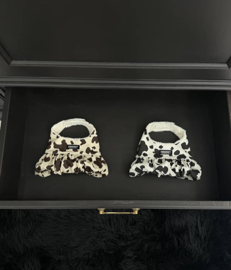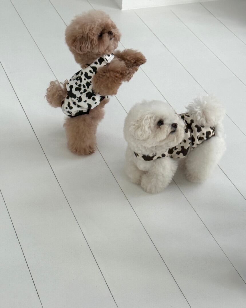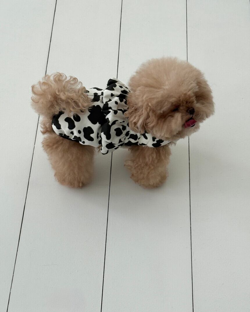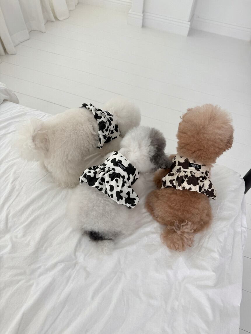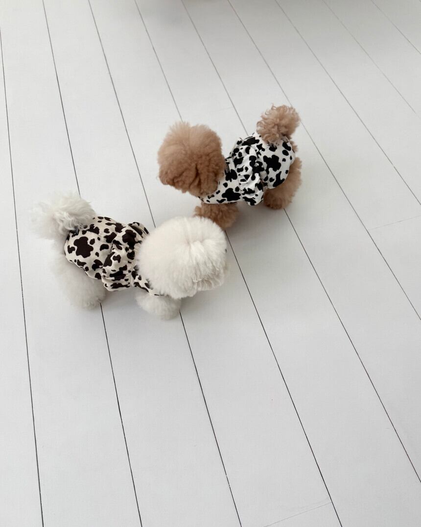 「カウ柄はどれも似ているのでは?」と思われるかもしれませんが、ペットウェアは人用の服よりもはるかに小さなサイズで作られるため、柄のバランスが仕上がりを大きく左右します。