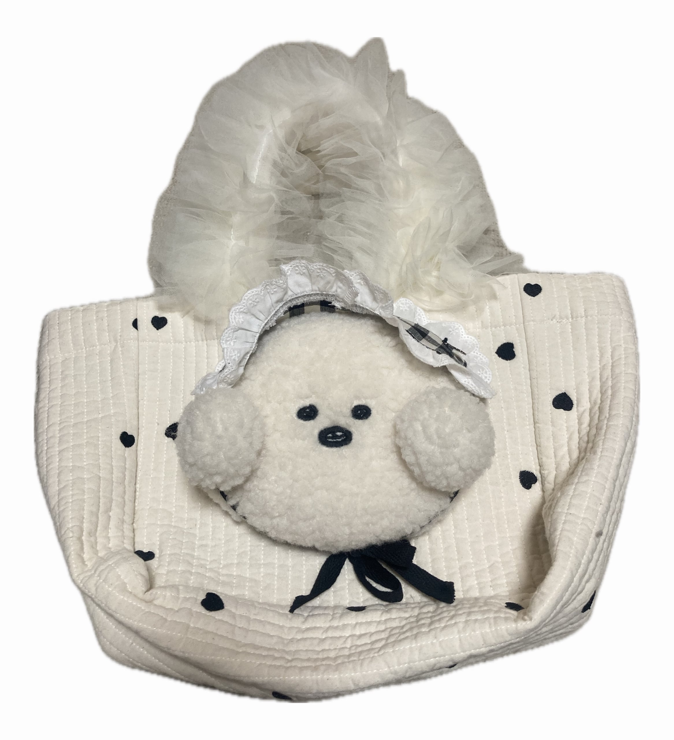 バッグ上部にはチュールフリルをたっぷりとあしらい、動くたびにふわりと揺れる華やかなアクセントを加えました。