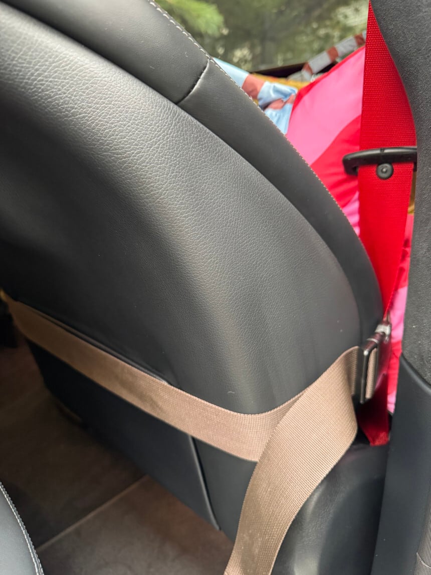 車の座席の上にカーシートを置き、シートベルトを後ろから回して座席に固定してください。
