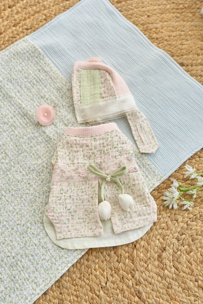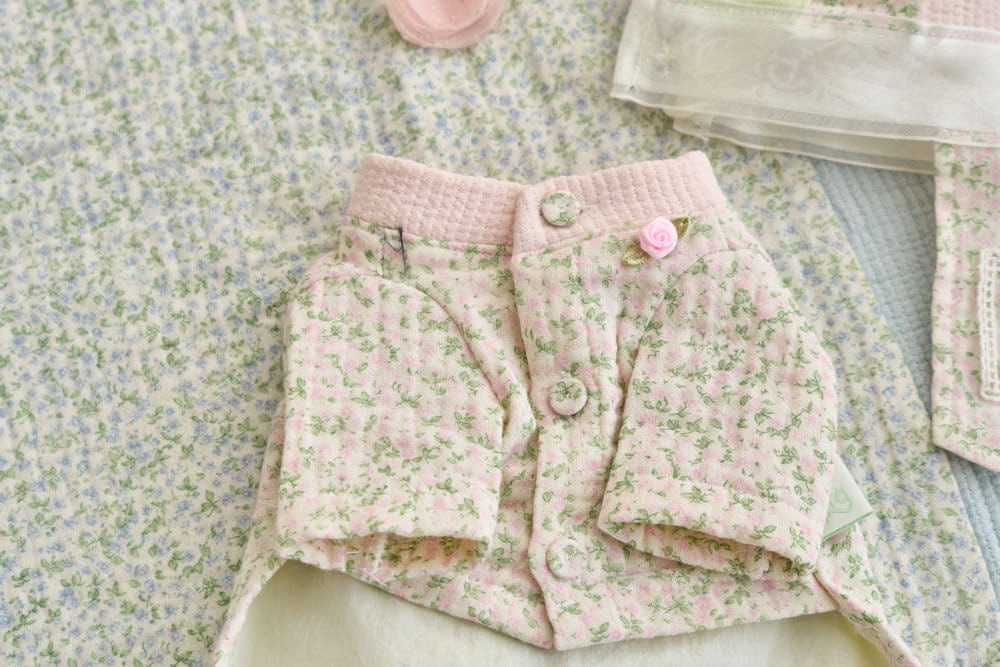 季節の変わり目にちょうど良い厚みの、柔らかなガーゼ三重織りのフラワープリント生地と、両面コットンのヌビムパディング(キルティング中綿)素材を使用しています。裏地には、60番手の高密度バイオウォッシュ加工を施した生地を採用し、腰部分にはローズ刺繍入りのメッシュ素材をポイントとしてあしらいました。