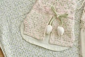 春らしいやさしく愛らしい雰囲気を感じられる生活韓服に仕上げています。軽量で動きやすく、日常使いとしても気軽にご着用いただけます。前立てにはフラワーくるみボタンと可愛らしいミニローズをポイントにあしらい、チューリップ飾りはセット商品としてお付けしております。