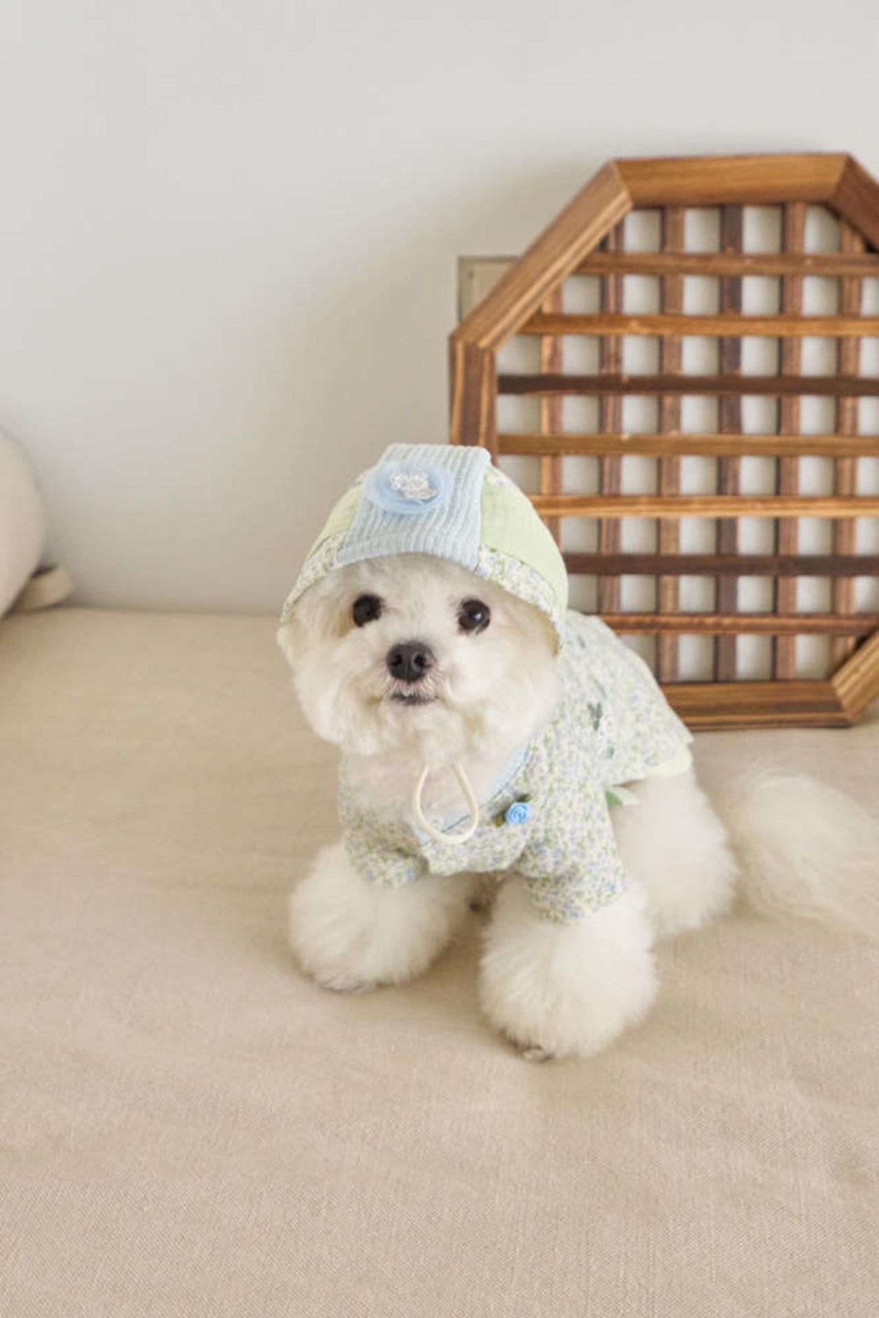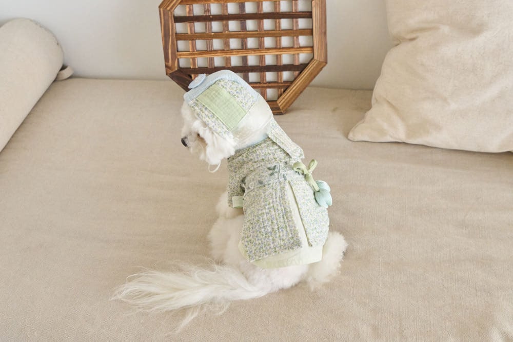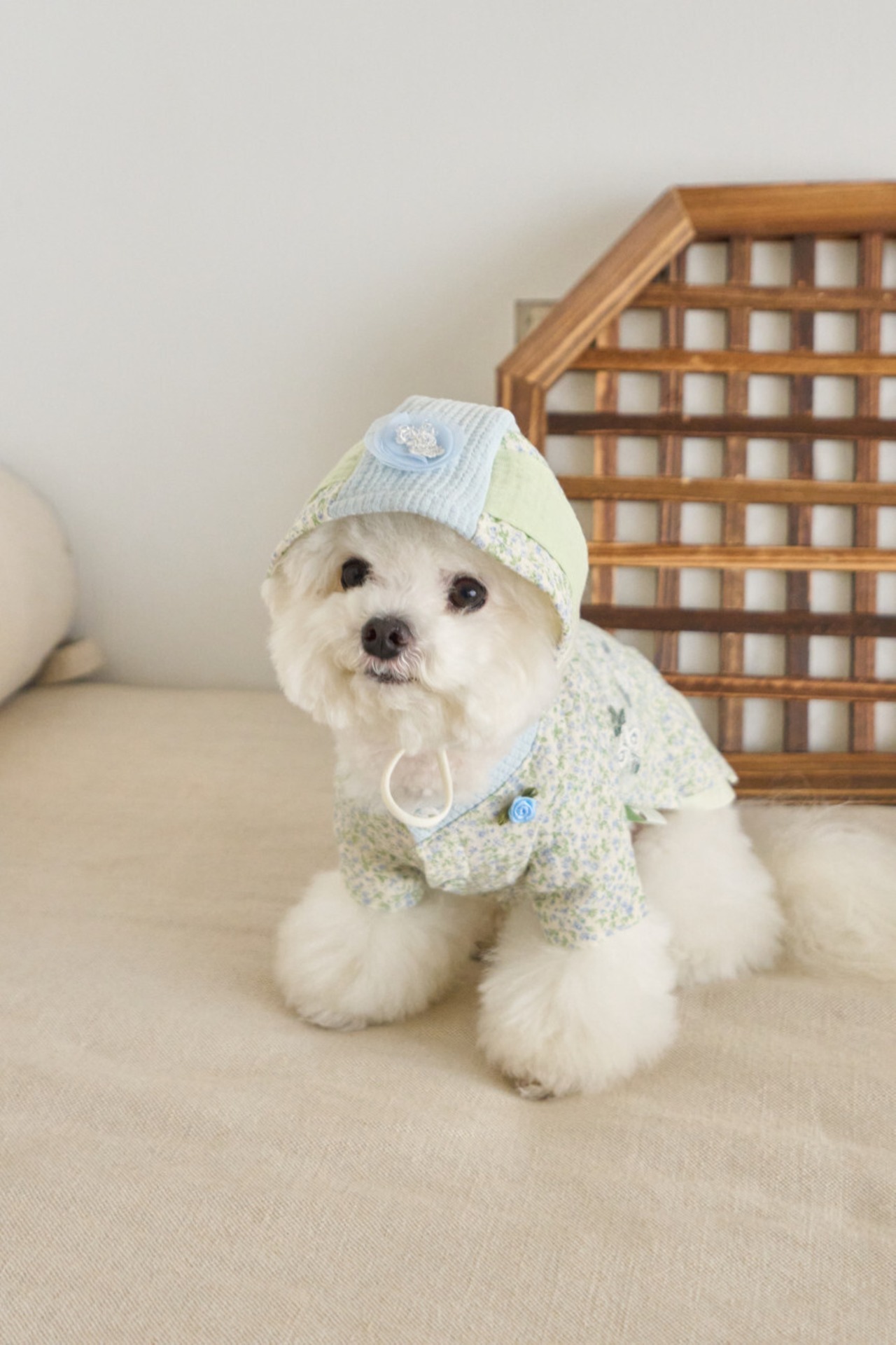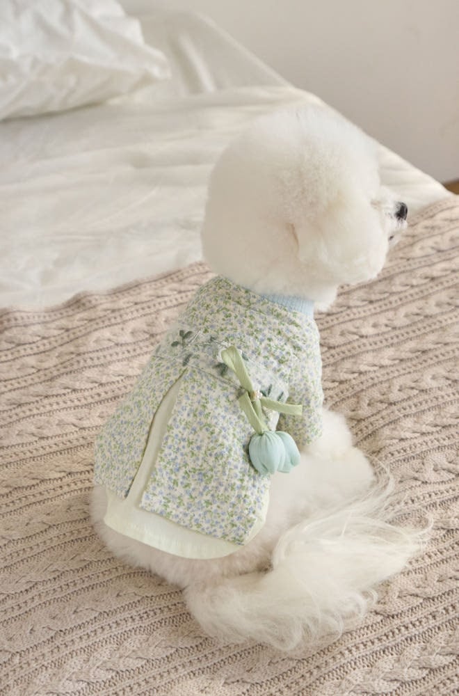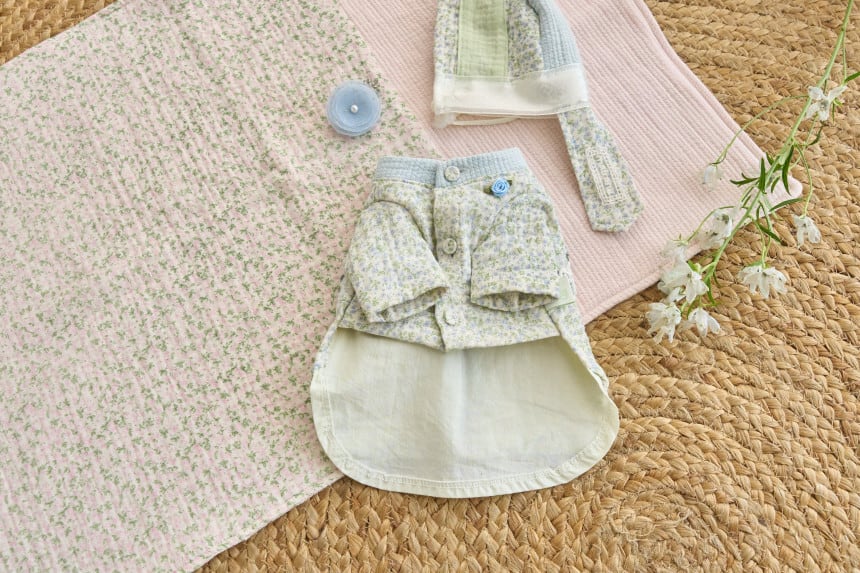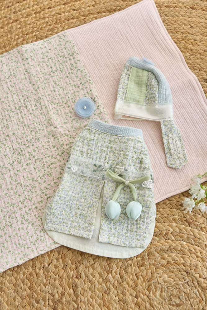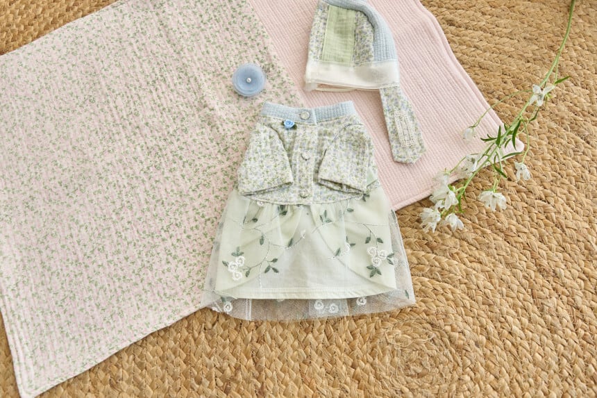 季節の変わり目にちょうど良い厚みの、柔らかなガーゼ三重織りのフラワープリント生地と、両面コットンのヌビムパディング(キルティング中綿)素材を使用しています。裏地には、60番手の高密度バイオウォッシュ加工を施した生地を採用し、腰部分にはローズ刺繍入りのメッシュ素材をポイントとしてあしらいました。