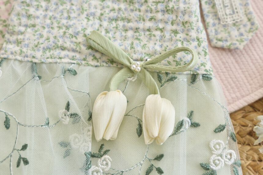 春らしいやさしく愛らしい雰囲気を感じられる生活韓服に仕上げています。軽量で動きやすく、日常使いとしても気軽にご着用いただけます。前立てにはフラワーくるみボタンと可愛らしいミニローズをポイントにあしらい、チューリップ飾りはセット商品としてお付けしております。