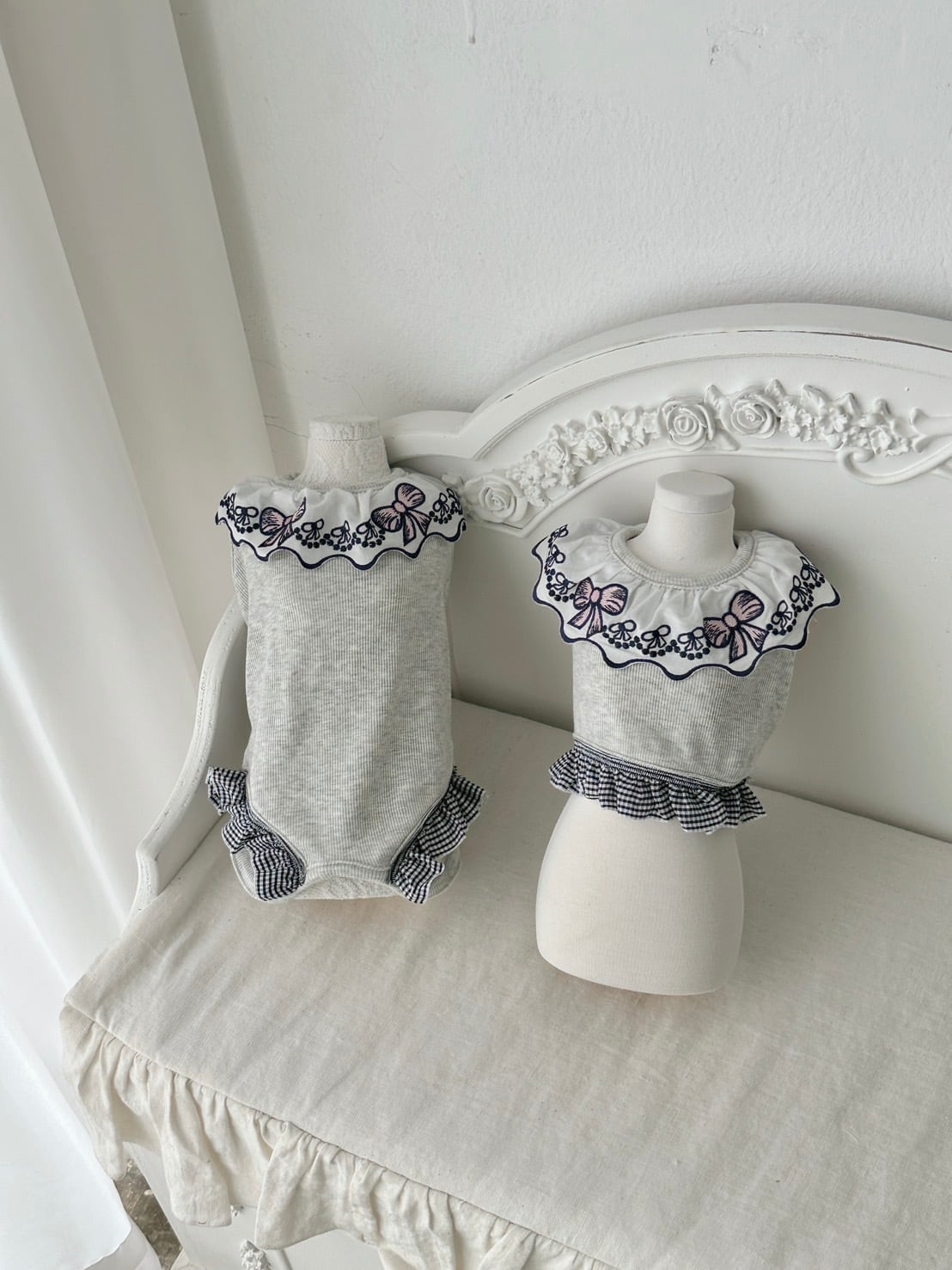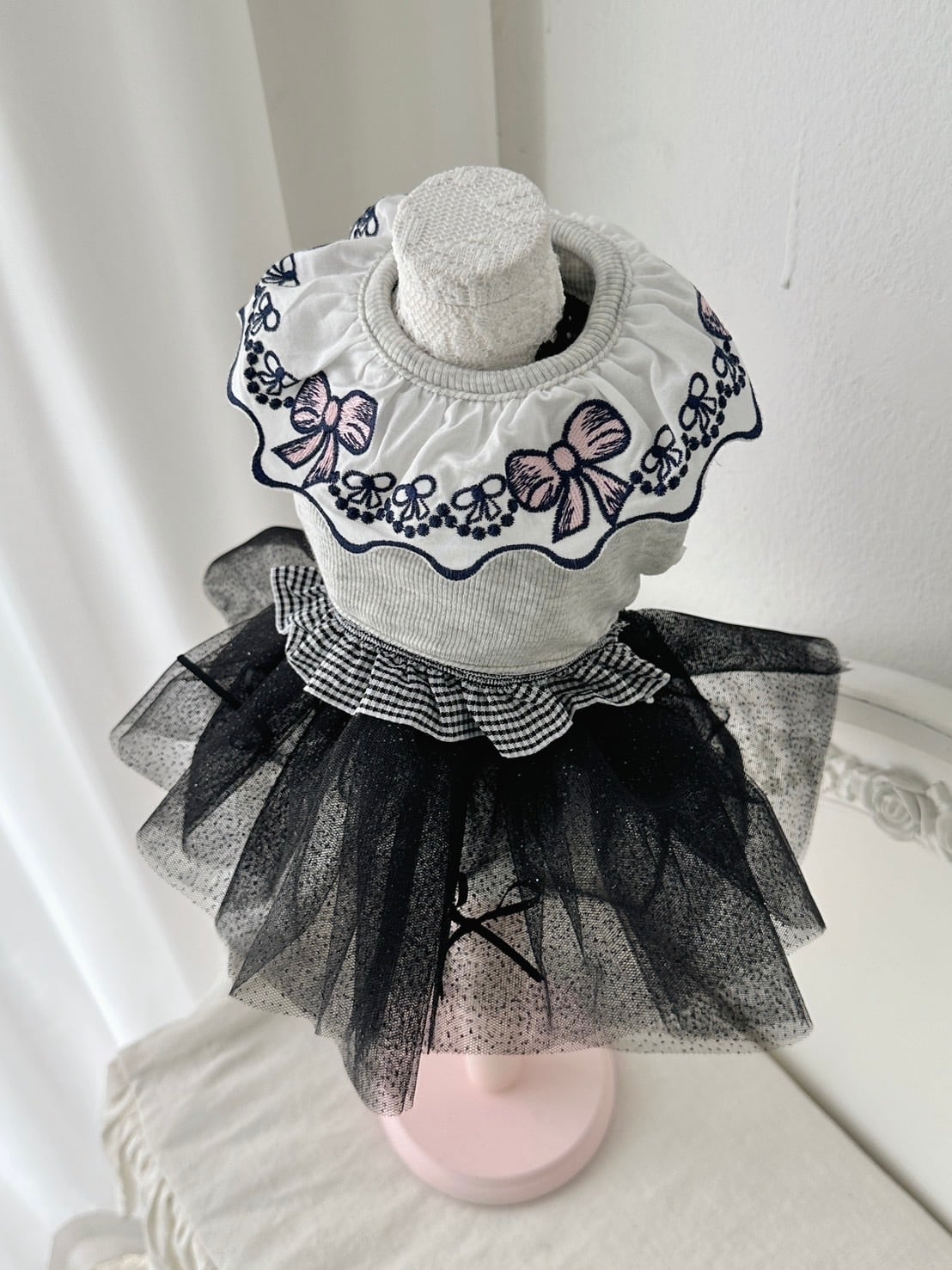 ネイビーラインの刺繍とピンクリボンをあしらったレースカラーを重ね、