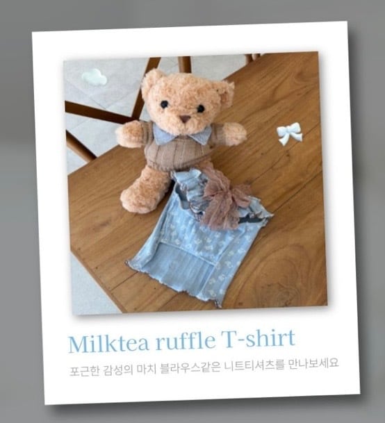 ホワイトのテディベア柄をさりげなくプリントし、主張しすぎない上品なアクセントに。裾と袖口のピコット仕上げが全体の完成度を高めています。