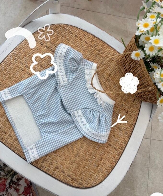 胸元中央のレースリボンパッチと、袖や裾にさりげなく施されたレースポイントが、着た瞬間に“小さなピクニックの主役”のような存在感を演出します。