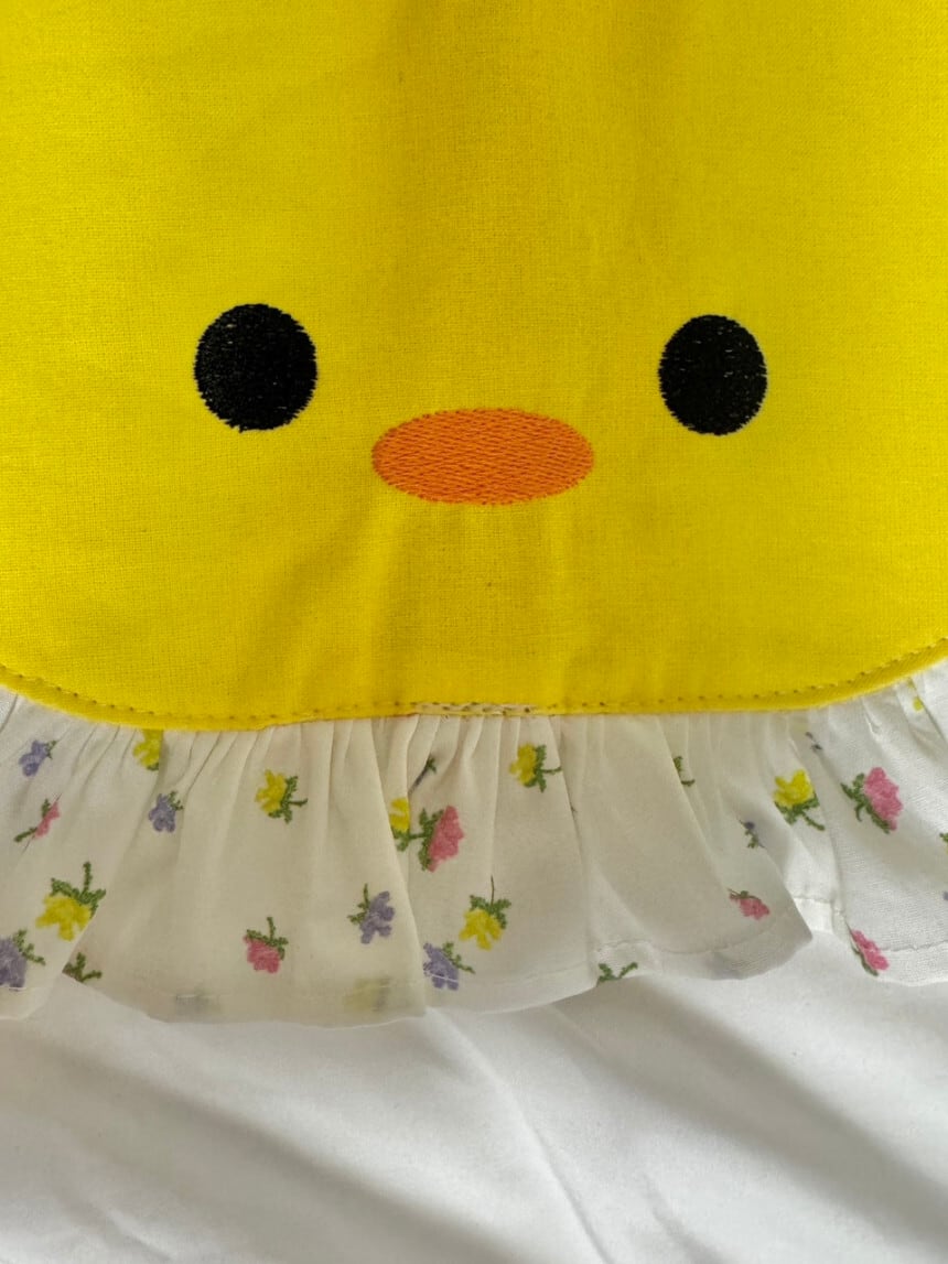 ・ひよこの目やくちばしの刺繍は、生地へのダメージを抑えるためシンプルに表現
