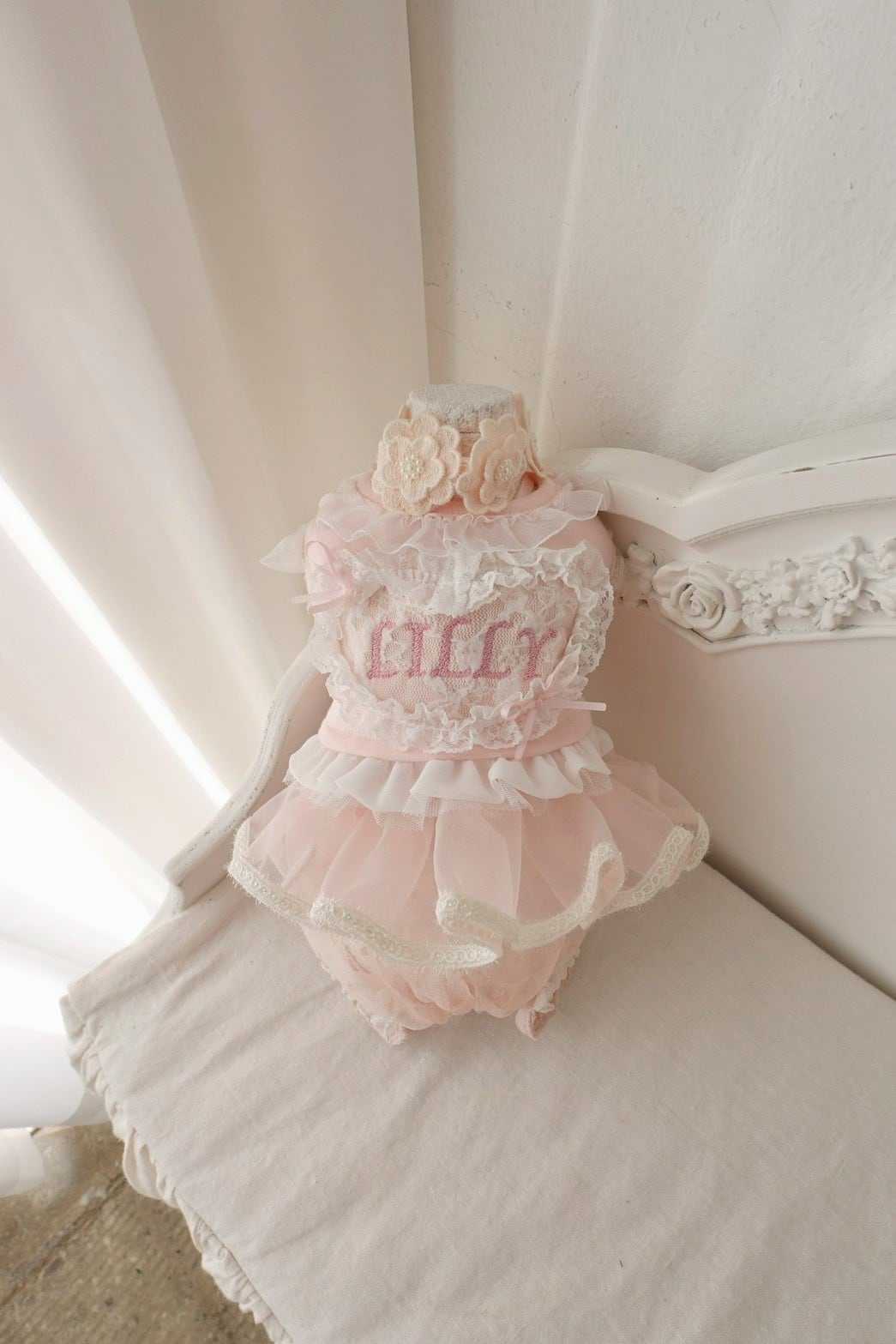 やわらかなピンクカラーの上にネーム刺繍を施し、