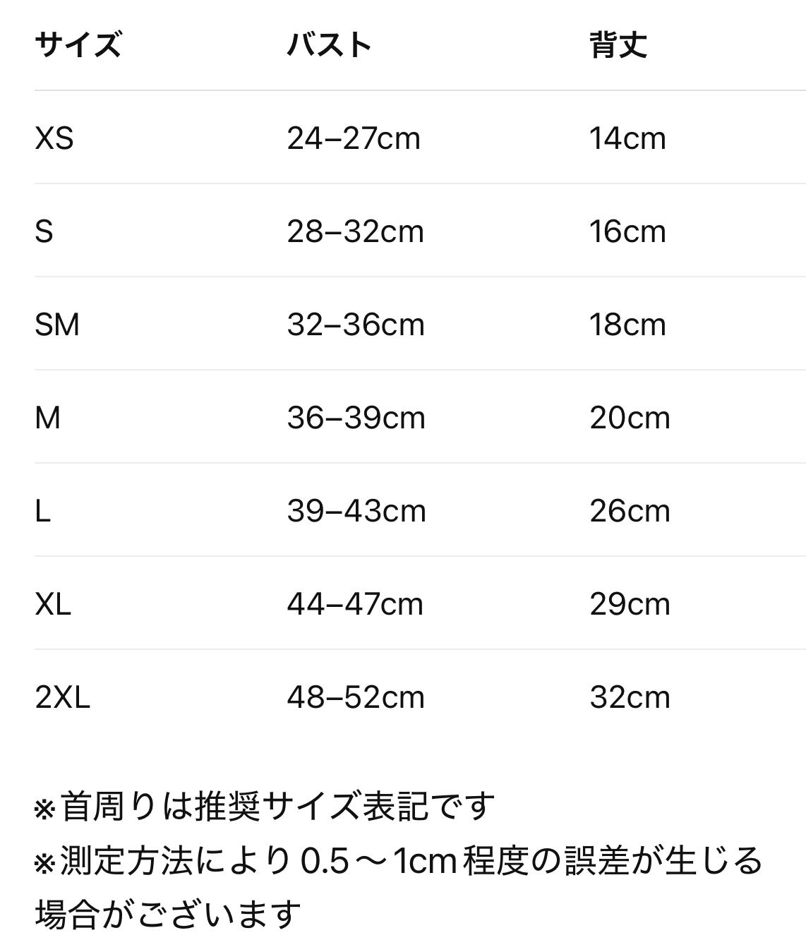 首、胸囲は実測サイズではなく、推奨サイズを記載しております。