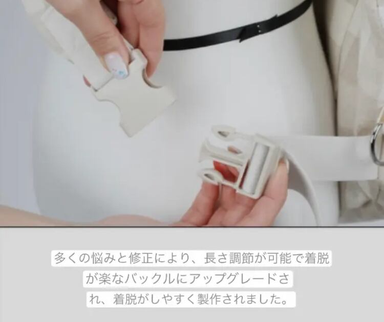 多くの悩みと修正により、長さ調節が可能で着脱 が楽なバックルにアップグレードされ、着脱がしやすく製作されました。
