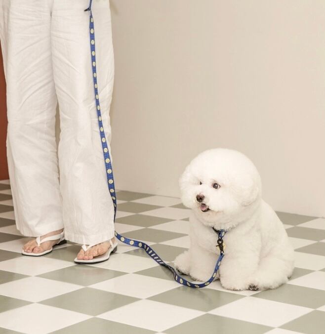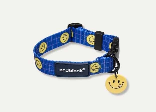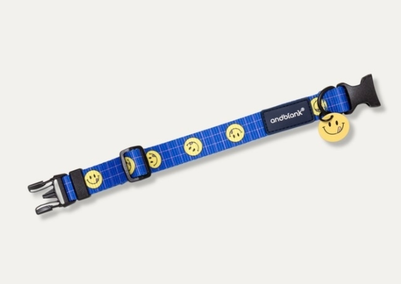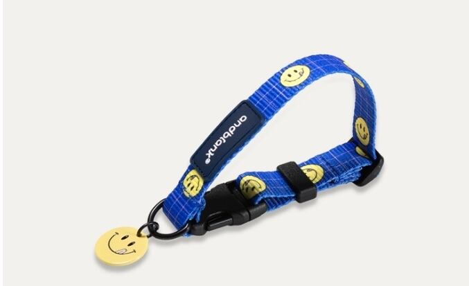 POPなアイコンと独自のデザインセンスで高品質な商品が大人気な韓国ブランド"andblank"と空間デザインと美味しいデザートやコーヒーに拘ったプレミアムデザートカフェ"Knotted"のコラボ商品のスマイル首輪(Blue)です。
