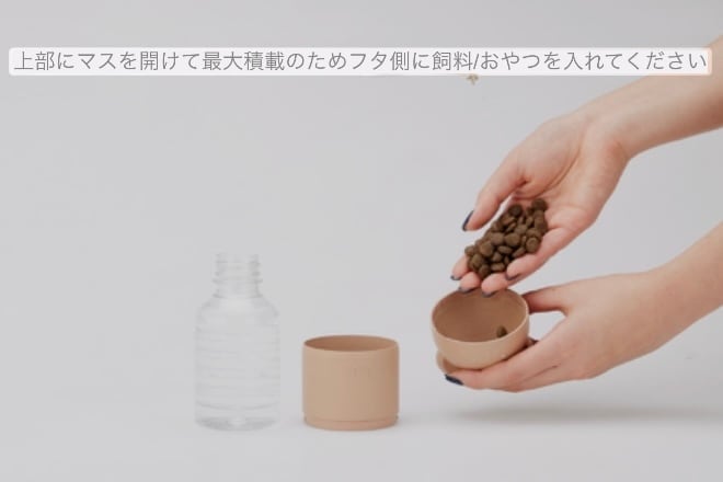 使用時にふたを開けて水を注ぐとコップとしても。ふたを開けておやつを給与すると幸せ感UP!