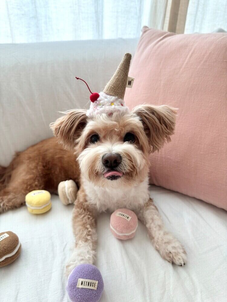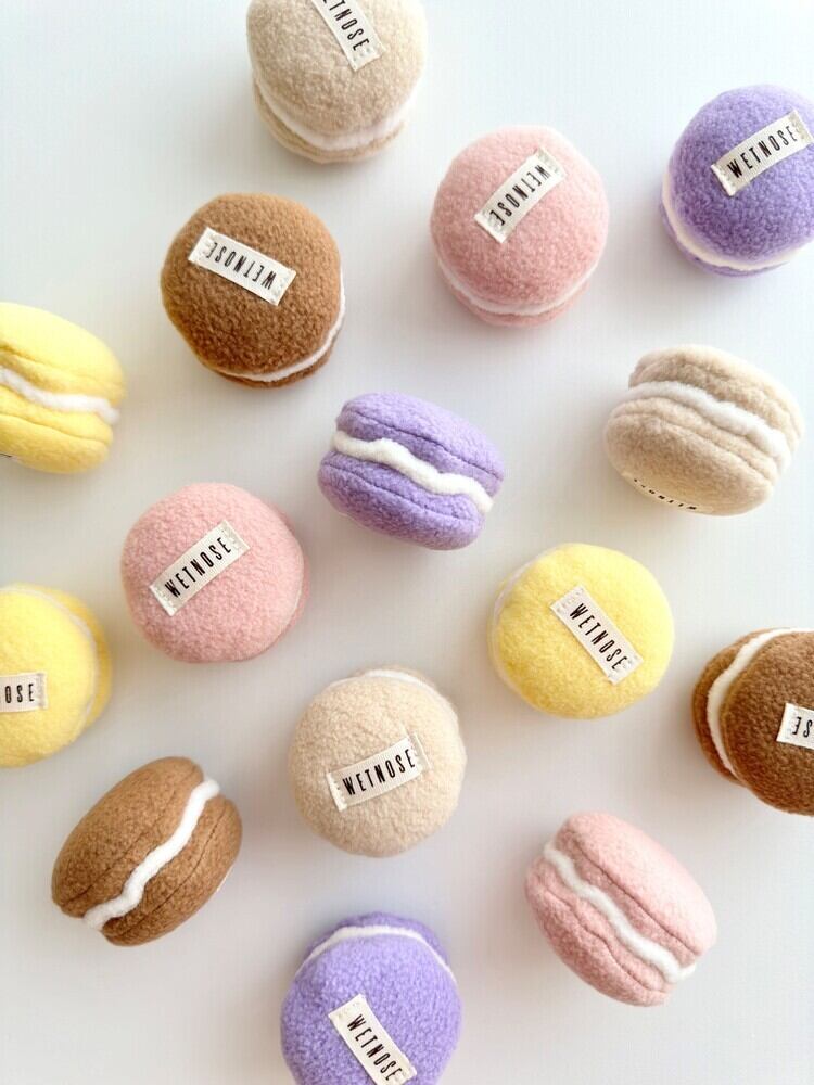 カサカサ音が鳴るマカロンの子犬のおもちゃです。