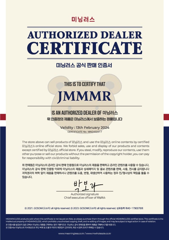 《meaningless》は犬体工学に基づいた独自のパターン技術を使用し、韓国国内で製造を全て行っております。Gosomiという可愛いクマさんがブランドのイメージキャラクターです。