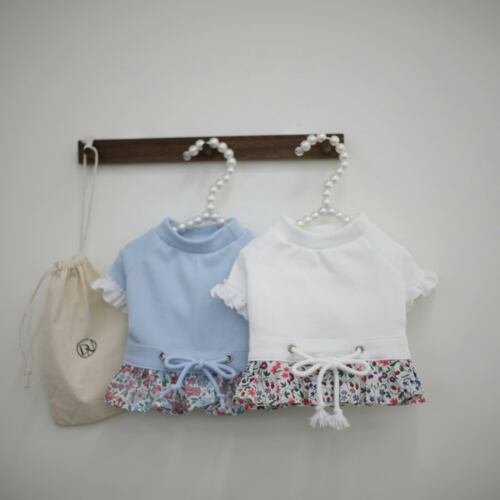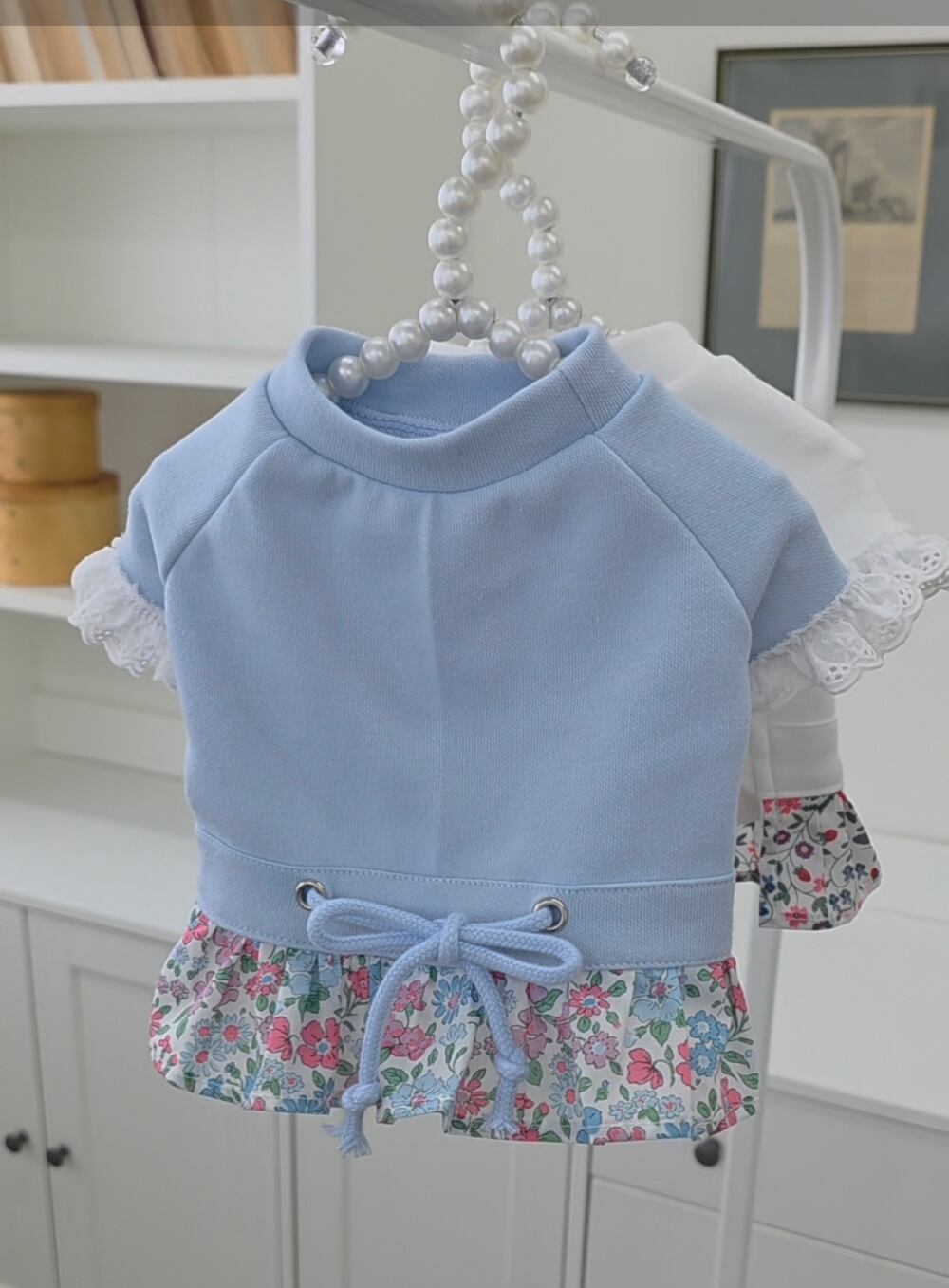 リバティ生地とウエストにと紐でポイントをつけたデザインです。